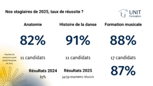 Unit Formation fonctionne de la même manière qu’une prépa. C’est à dire que l’on vous donne les connaissances nécessaire à la réussite de l’examen. Vous pouvez ensuite vous présenter en candidat libre aux épreuves des UE théoriques. La note sera représentative de votre oral (anatomie, formation musicale) ou de votre rédaction (histoire de la danse) le jour de l’examen.